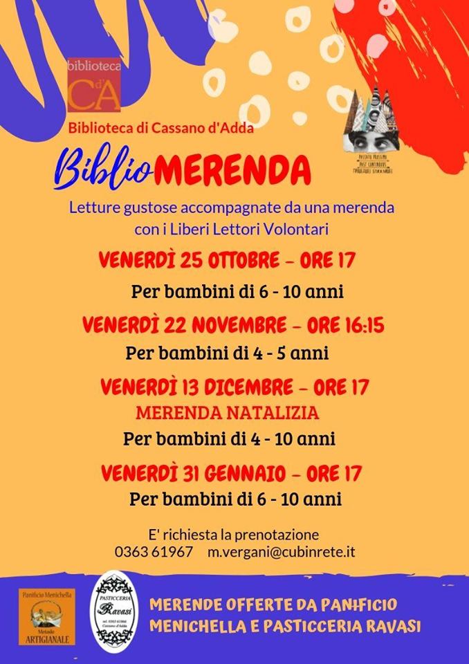 Bibliomerende d’Autunno a Cassano d’Adda! Pubblicato dameriwpppo24 ottobre, 201919 febbraio, 2024Pubblicato in: Biblioteche, Didattica, Eventi Tornano le merende pomeridiane in biblioteca!📚🍎🥧🍰Letture gustose con i Liberi Lettori Volontari offerte da Panificio Menichella e Pasticceria Ravasi.