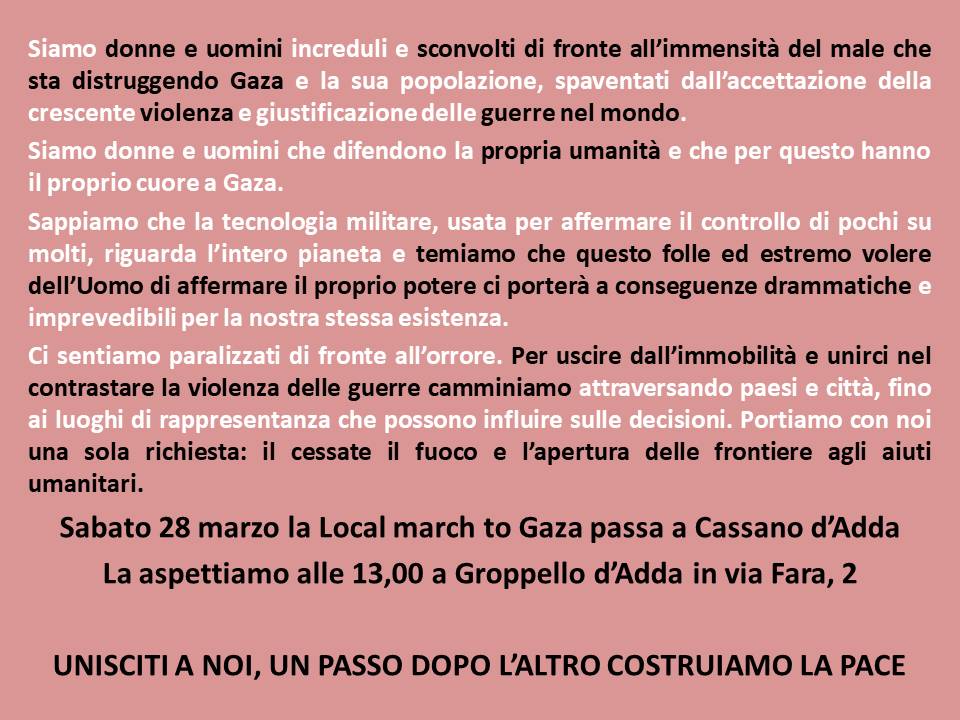 Local March for Gaza Pubblicato dameriwpppo27 marzo, 2026Pubblicato in: Attività, Eventi, Progetti Sabato siamo a Groppello d’Adda per la Local March for Gaza: il nostro banchetto sarà punto di accoglienza per i partecipanti alla tappa. Vieni a trovarci!